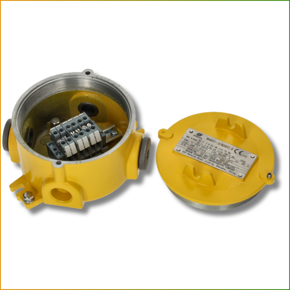 Projetada para áreas com risco de explosão (Zonas 1, 2, 21 e 22), esta caixa garante conexões elétricas seguras graças às suas três portas roscadas M25 x 1,5 (vedadas com um plugue hexagonal). Sua tampa roscada com parafuso Allen garante estanqueidade e fácil acesso. Ideal para indústrias como petroquímica, farmacêutica, militar e marítima, onde a segurança é essencial.