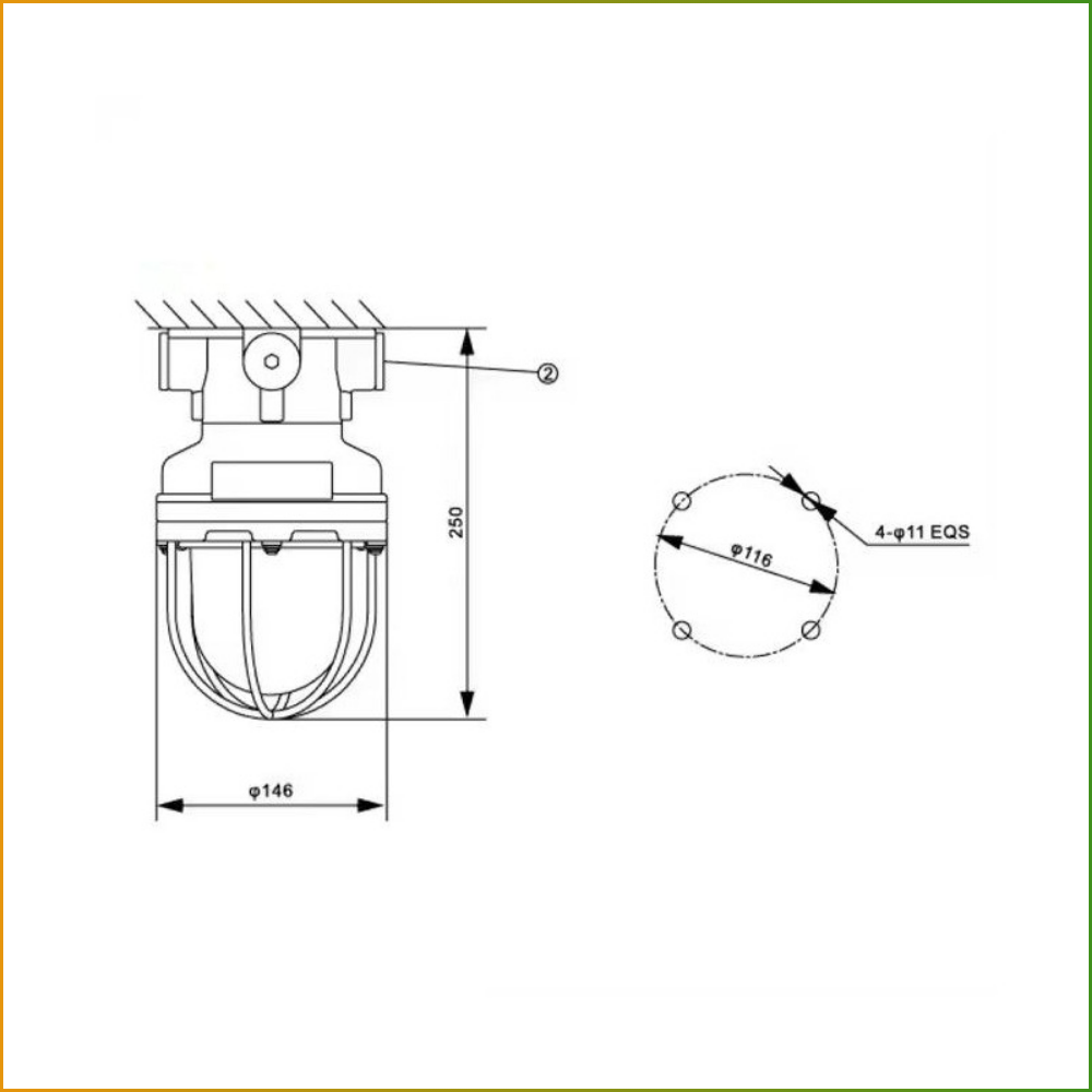 Compatível exclusivamente com lâmpadas de casquilho E27 (não incluídas). Inclui uma caixa de junção redonda com quatro portas roscadas M25 x 1,5, projetada para acomodar prensa-cabos ATEX de acordo com requisitos específicos