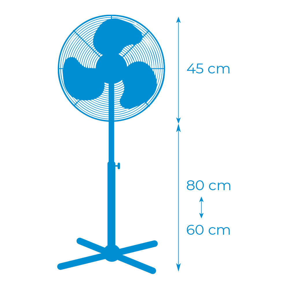 VENTOINHA DE PÉ, BRANCO. POTÊNCIA: 45W PASSAGEM: Ø40cm. ALTURA REGULÁVEL 105-125cm. 3 VELOCIDADES. MOVIMENTO OSCILANTE E ÂNGULO DE INCLINAÇÃO AJUSTÁVEL. FLUXO AR 3000m³/h, dB 60, 220-240V 50Hz 3 PASSOS